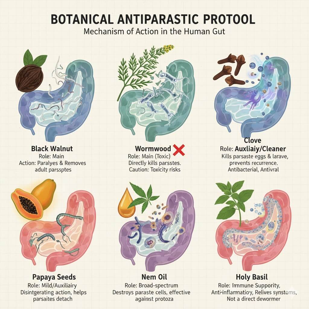 It contains a powerful blend of natural anti-parasitic botanicals: Black Walnut, Wormwood, Clove, Papaya Seed, Oregano Oil, Holy Basil — all designed to target parasites at all stages of life: from eggs to larvae to adults.